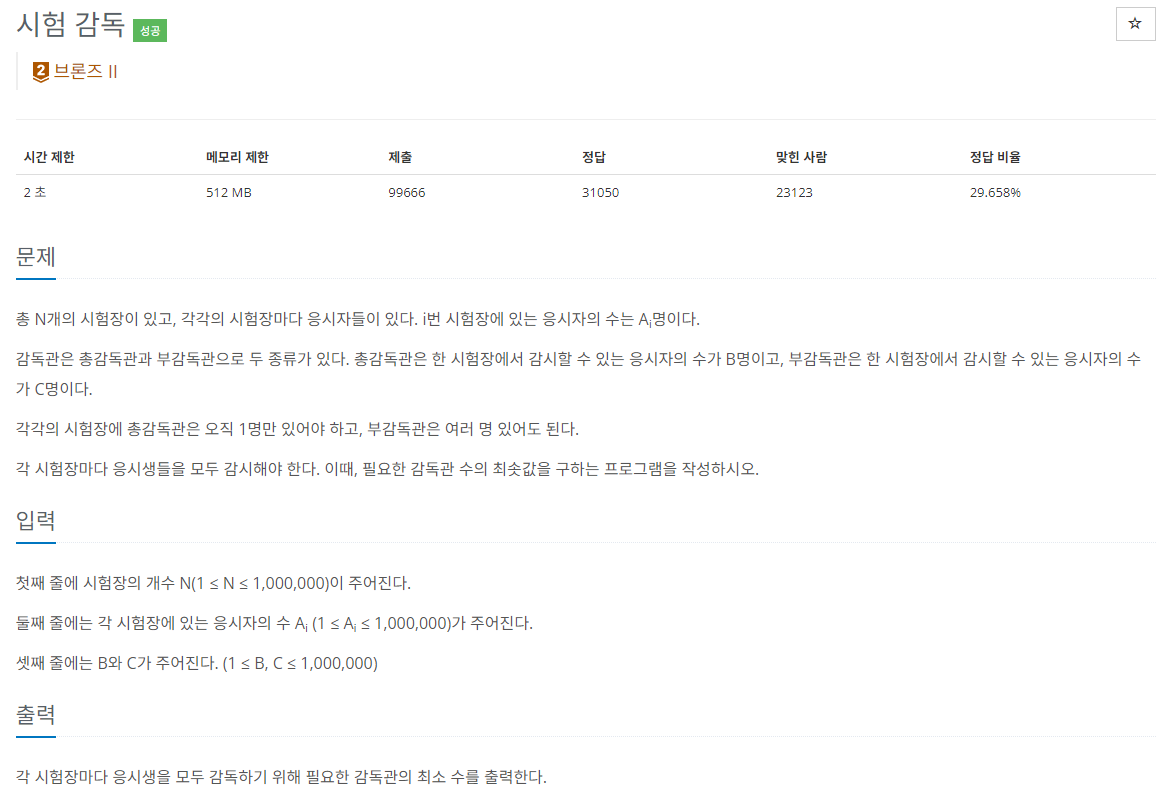// B -> 총 감독관 한명, C -> 부 감독관은 여러명일 수 있다.