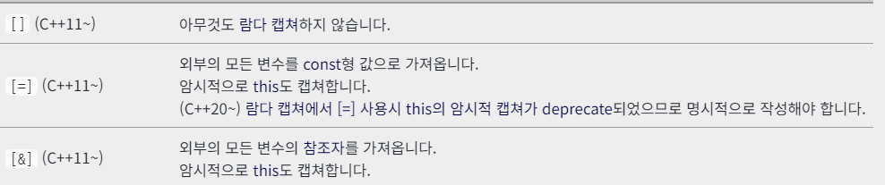 // 인자가 없는 void() 면 [=], [=]() 표현 가능